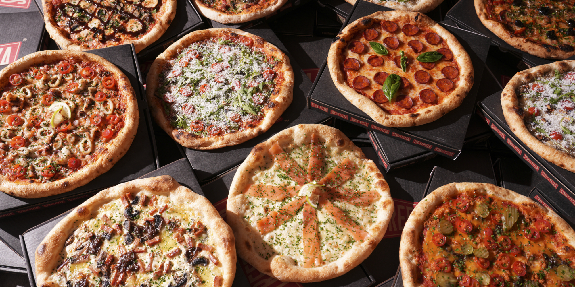 Sauce tomate, mozzarella, gambas, courgettes, tomates confites, roquette, huile d'olive citronnée